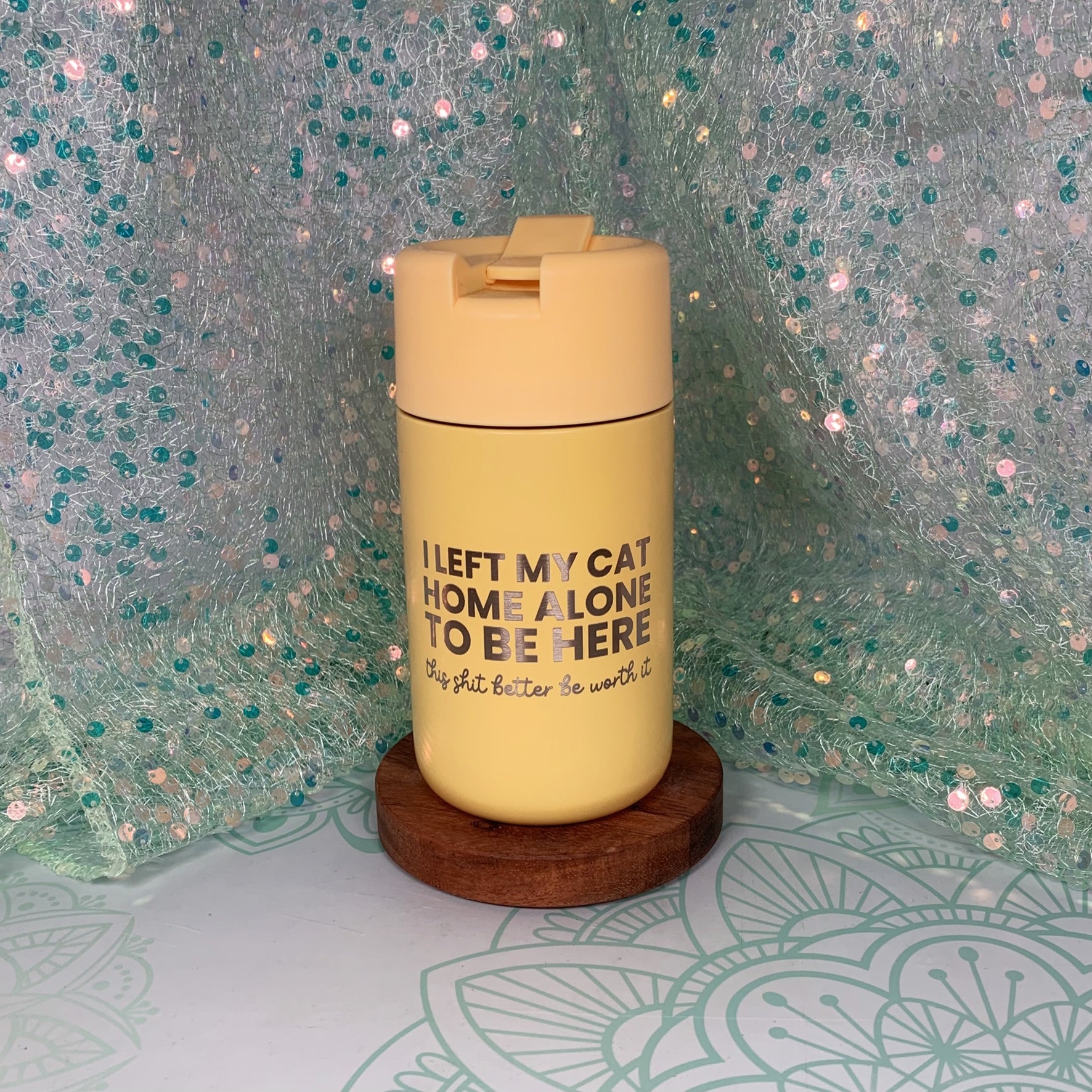 For the cat parent who knows they’ll be judged later — this mug captures your mood and your priorities. Engraved with your brutally honest excuse, it’s made from sleek stainless steel and designed for those rare occasions when you actually leave the house (against your better judgment).